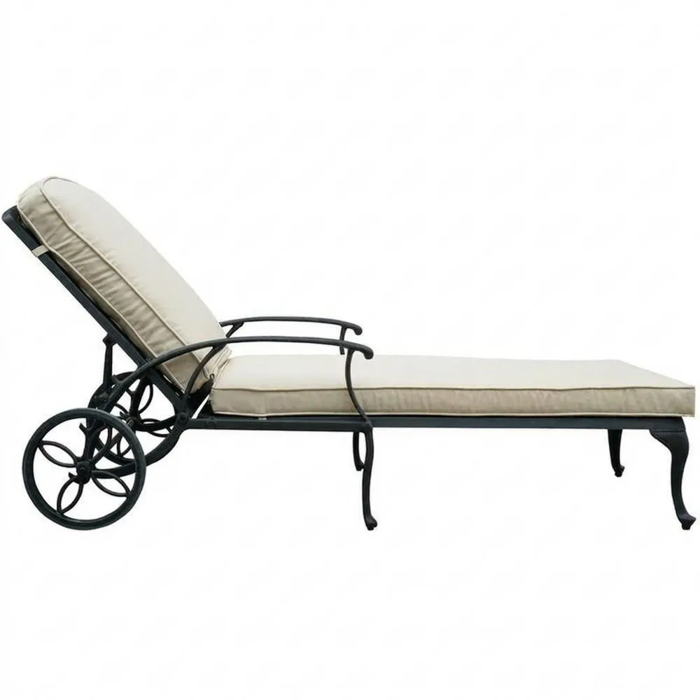 Gartenliegestuhl aus Aluminium mit beigem Kissen und Rollen