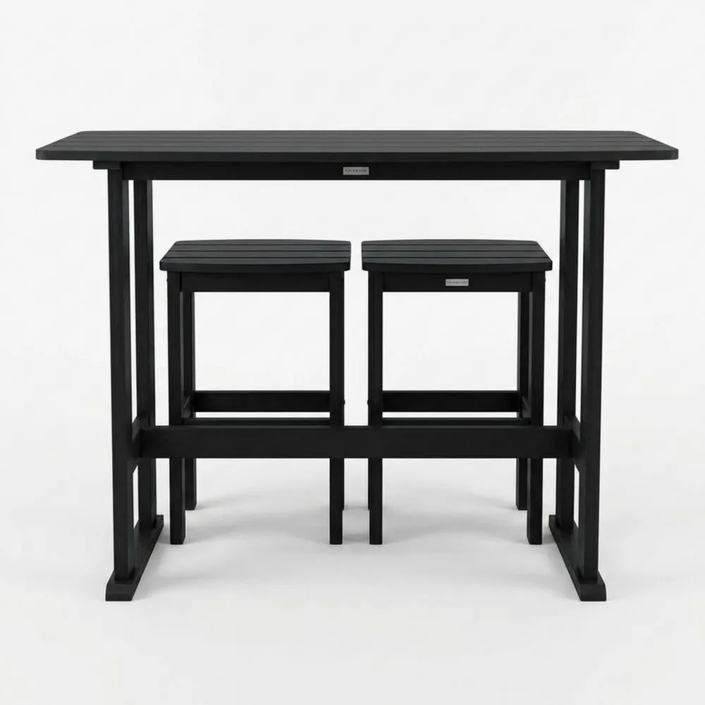 Das Set besteht aus einem Aluminiumrahmen. Die Tischplatte und Sitzflächen der Hocker sind aus Polywood. Der Tisch misst 120 cm in der Länge, 60 cm in der Breite und 100 cm in der Höhe. Die Hocker haben eine Sitzhöhe von 70 cm. Das Gesamtgewicht des Sets beträgt 25 kg.