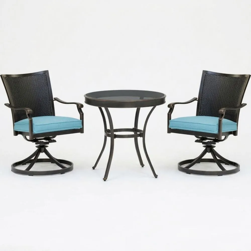 Gartenmöbelset aus pulverbeschichtetem Aluminium mit Glastisch und Schaukelstuhl in Schwarz/Blau
