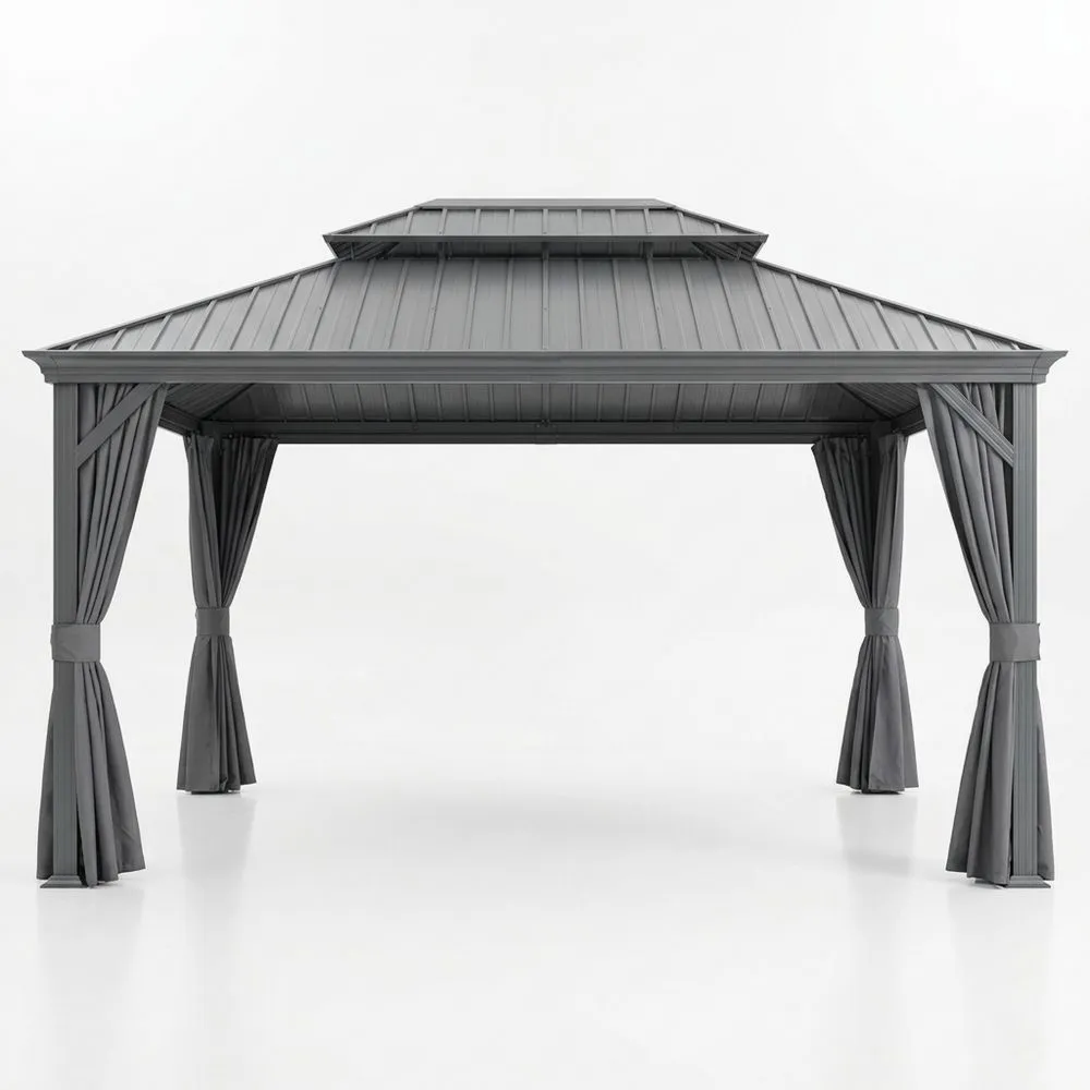 Dieser Pavillon besteht aus einem Aluminiumrahmen und einem Stahldach. Die abnehmbaren Vorhänge sind aus Polyesterfaser gefertigt. Seine Maße sind 300 cm breit, 400 cm tief und 260 cm hoch. Der Pavillon wiegt 60 kg.