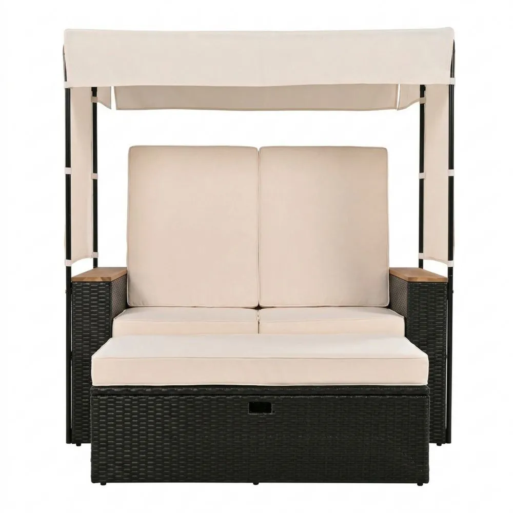 Diese Gartenliege ist aus einem rattanähnlichen Material gefertigt und mit Polyester gefüllt. Das Gestell besteht aus pulverbeschichtetem Stahl und hat eine maximale Tragkraft von 200 kg.