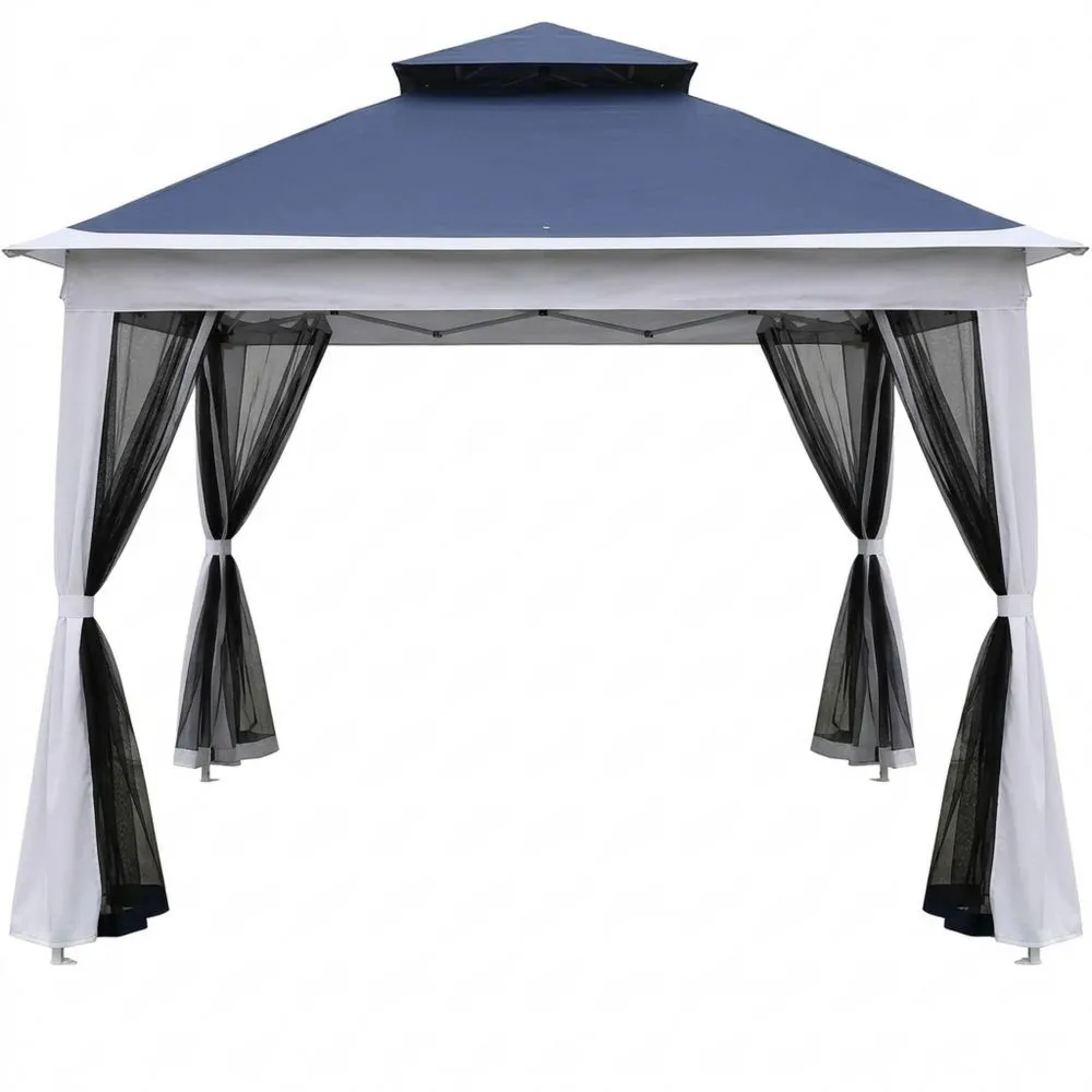 Das Zelt hat ein Stahlgestell und ein Dach aus wasserdichtem Polyestergewebe. Die Seitenwände bestehen aus abnehmbarem Polyester-Netzstoff.