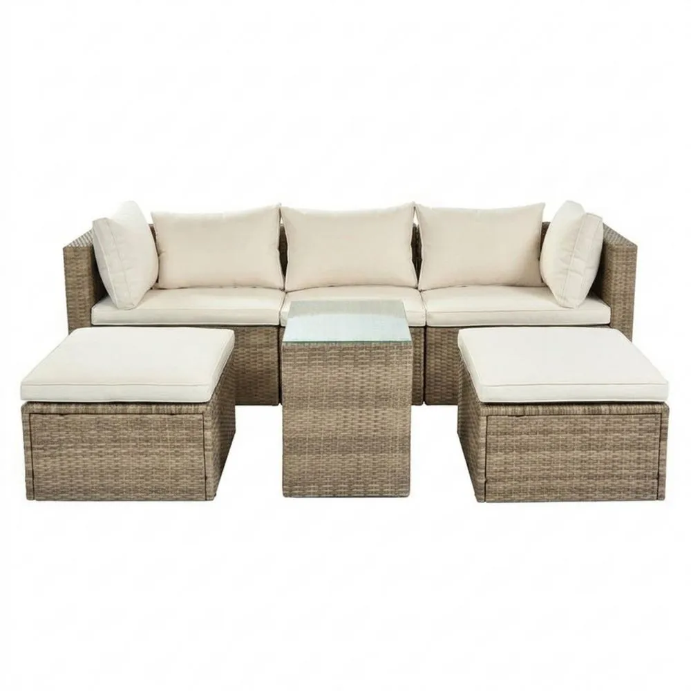 Das Gartenmöbel-Set enthält ein dreiteiliges Sofa, einen Tisch und zwei Hocker. Gefertigt aus Polyrattan mit einem Stahlrahmen. Die Polsterbezüge bestehen aus Polyester und die Tischplatte ist aus gehärtetem Glas.